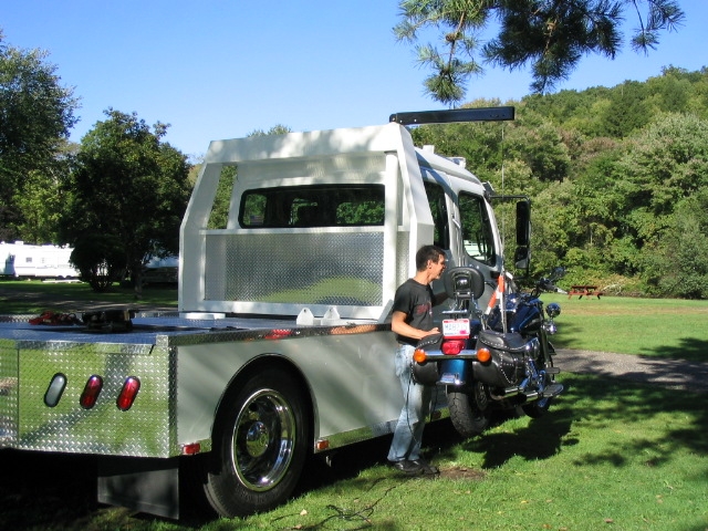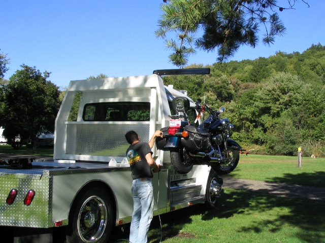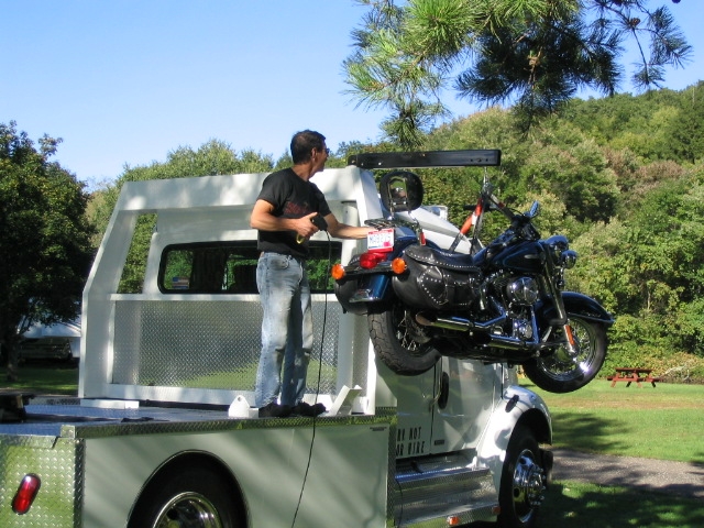 THE TOP LOAD SYSTEM IS DESIGNED TO LOAD COMMERCIAL CARGOES WHEN NOT LOADING THE BIKE THE CRANE BOOM HIDES IN THE HEADACHE BAR WHEN NOT IN USE |